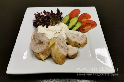 Відбивна зі свинини з печерицями, помідором, сиром, майонезом