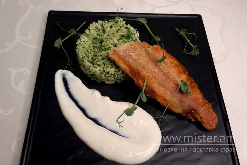 VIN&GRET Морський окунь з зеленим рисом та сирним соусом