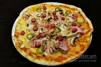 Моцарела, мисливські ковбаски, шинка, буженина, печериці, цибуля маринована, огірок маринований, соус томатний, соус часниковий