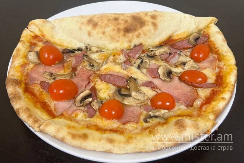 Моцарела, печериці, шинка, ковбаски мисливські, помідор чері, соус томатний, соус часниковий.