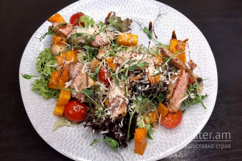Качина грудка, чері, печериці, пармезан, соус бальзамік, гарбуз, мікс салатів.