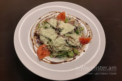 Телятина, баклажани, помідори, сир пармезан, мікс салатів, соус огірково-вершковий.