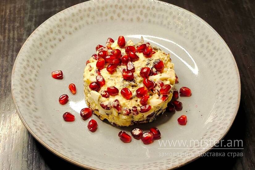 Куряче філе, чорнослив, яйце куряче, грецький горіх, гранат, майонез.