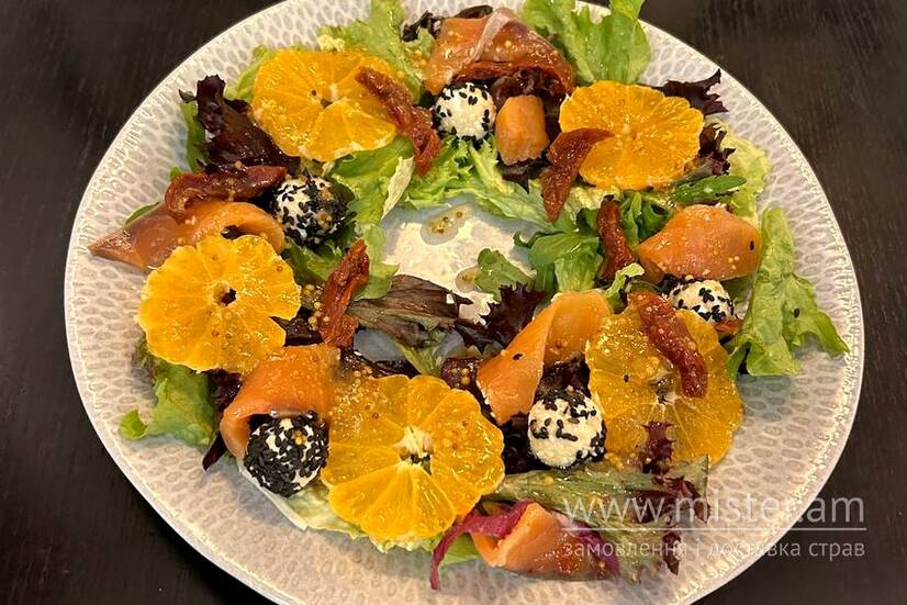 Мікс салатів, лосось, томати в`ялені, крем-сир, мандарин.