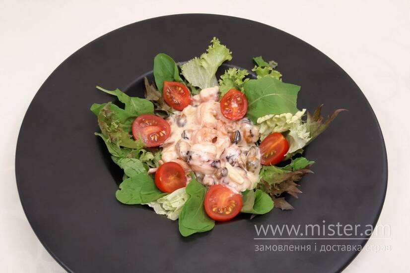 Морський коктейль, креветки, вершки, часник, сир брі, томати чері.