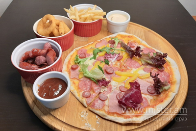 Піца Баварія, цибулеві кільця, картопля фрі, ковбаски, соуси