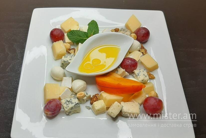Брі, Дорблю, моцарела, пармезан, мед, волоські горіхи, фундук, фрукти.