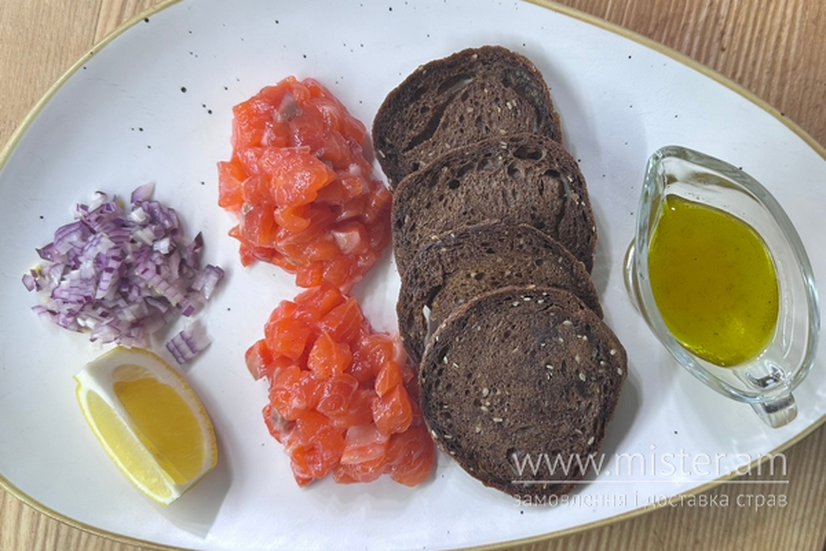 Лосось, цибуля, спеції, лимон, хліб гречаний.