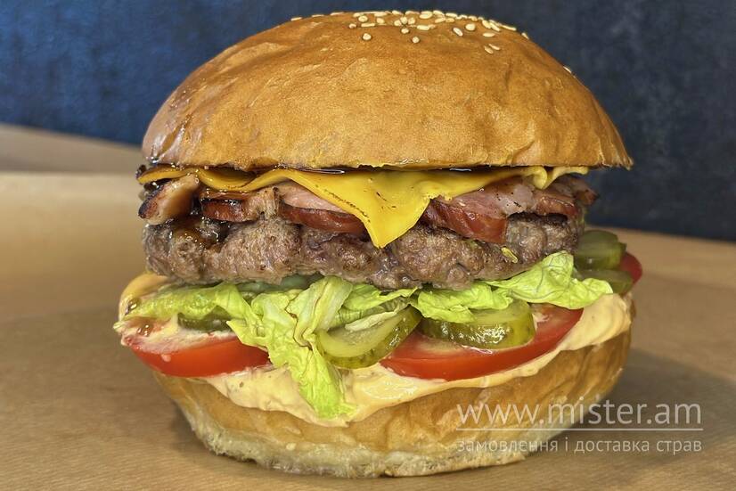 Кунжутна булочка, яловича котлета, сир чеддер, смажений бекон, салат айсберг, огірок маринований, помідор, соус барбекю.