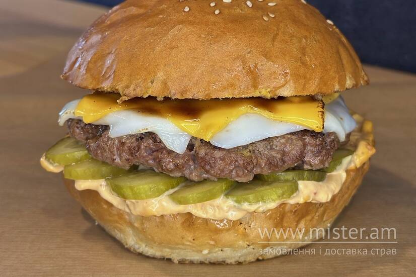 Булочка кунжутна, яловича котлета, сир моцарелла, чеддер, огірок маринований, соуси: фірмовий, барбекю.