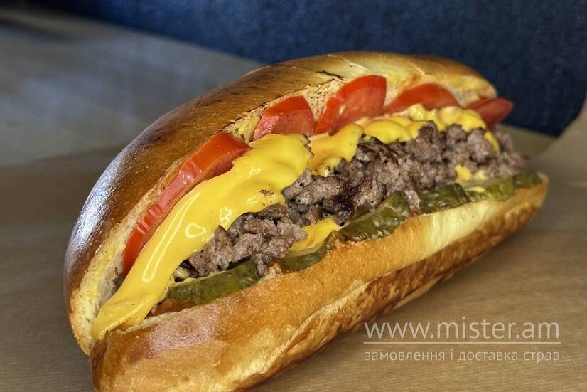 Фарш яловичий, сир чеддер, огірок маринований, помідор, соуси: солодка гірчиця, кетчуп-сацебелі.