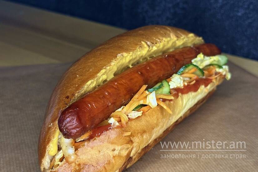 Ковбаска підкопчена, пекінська капуста, морква по-корейськи, огірок, соуси: солодка гірчиця, кетчуп-сацебелі.