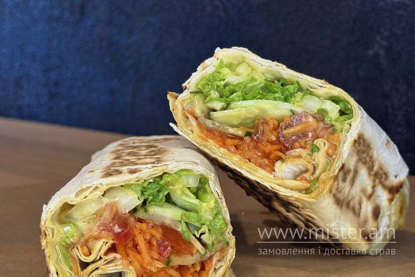 Капуста пекінська, огірок, помідор, морква по-корейськи, соуси: часниковий, кетчуп-сацебелі.