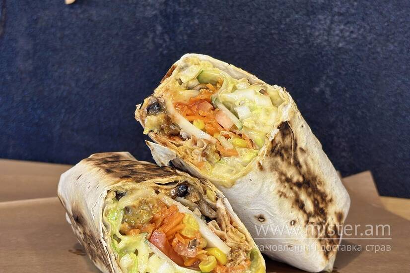 Курка гриль, сир моцарелла, огірок, помідор, кукурудза, гриби шампіньйони, капуста пекінська, морква, соуси: фірмовий, кетчуп-сацебелі.