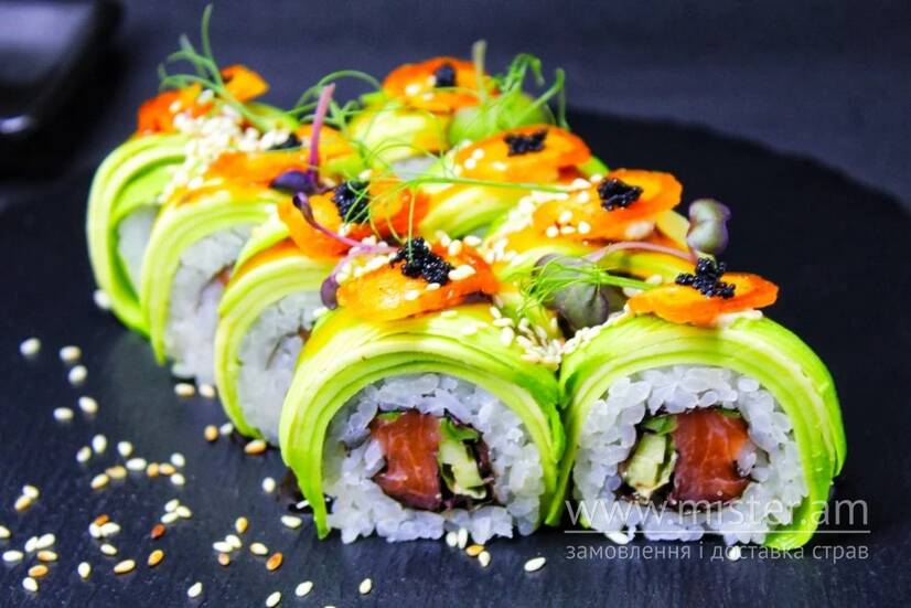 Лосось, авокадо, лист салату, огірок, соус кімчі, соус унагі, ікра тобіко, кумкват.