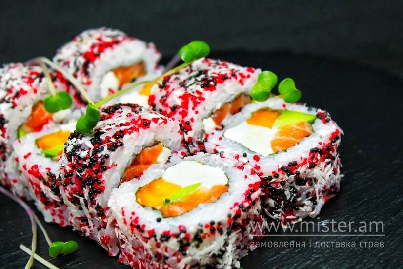 Лосось, крем-сир, авокадо, манго, ікра тобіко, кокосова стружка.