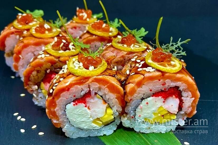 Лосось, креветка, крем-сир, манго, масаго ікра, кумкват, соус унагі, червона ікра, кунжут.