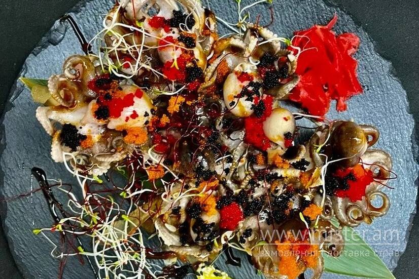 Восьминіг бебі, крем-сир, огірок, авокадо, стружка тунця, ікра масаго.
