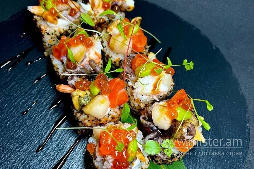 Лосось вугор, креветка, восьминіг, морський гребінець, мідія, крем-сир, огірок, авокадо, червона ікра, кунжут, ікра масаго, соус унагі, соус кімчі.