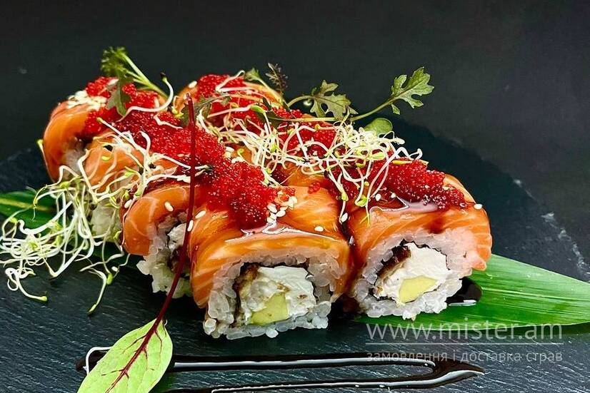 Лосось, вугор, крем-сир, авокадо, ікра тобіко, соус унагі, кунжут.