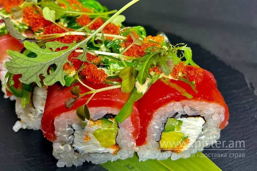 Тунець, ікра масаго, крем-сир, огірок, авокадо, чука, соус горіховий, кунжут.