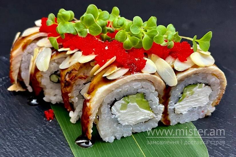 Вугор, крем-сир, авокадо, огірок, соус унагі, ікра тобіко, кунжут.