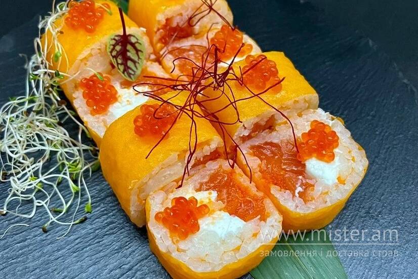Соєвий папір, лосось, крем-сир, ікра масаго, ікра червона.