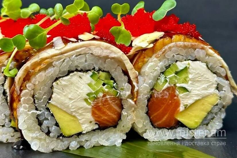 Вугор, лосось, крем-сир, авокадо, огірок, мигдаль, ікра масаго, соус унагі.