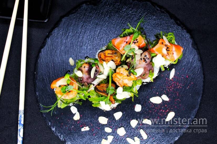 Крем-сир, огірок, авокадо, чука, креветка, бебі восьминіг, лосось, вугор, мідії, соус унагі, пелюстка мигдаля.