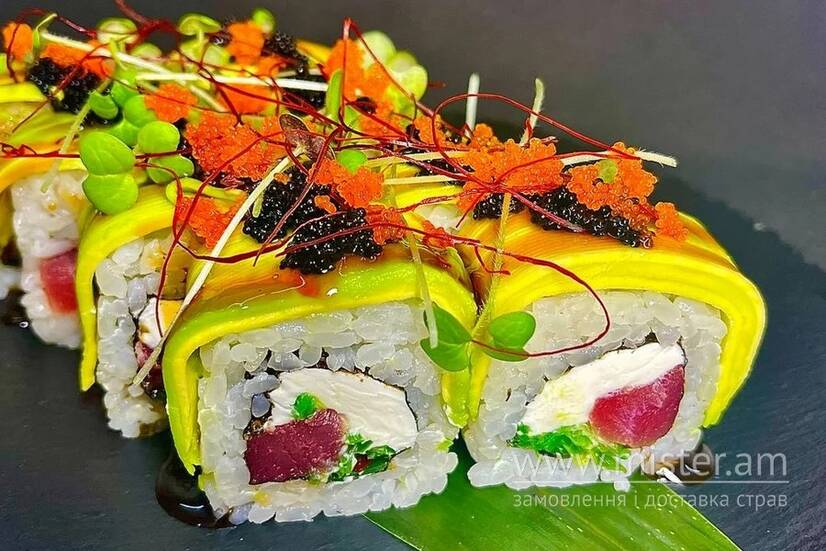 Тунець, крем-сир, авокадо, чука, соус унагі, ікра тобіко.