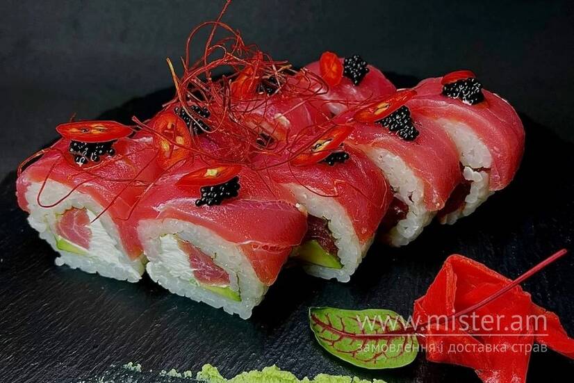 Тунець, крем-сир, авокадо, соус кімчі, ікра тобіко, перець чилі.