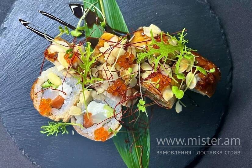 Вугор, креветка, лосось, крем-сир, огірок, пелюстка мигдаля, червона ікра, соус унагі.