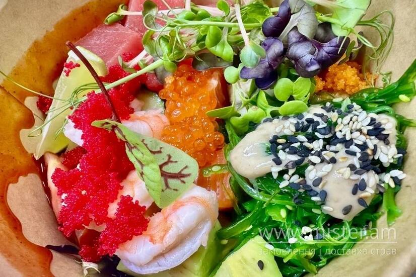 Креветка, вугор, лосось, тунець, мікс салату, огірок, авокадо, хіяші, черрі, боби едамаме.