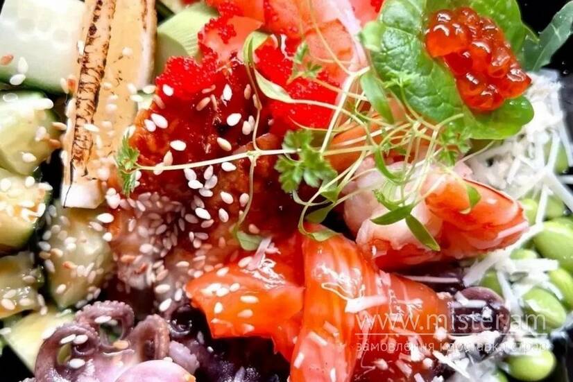 Тигрова креветка, лосось, бебі восьминіг, вугор, мікс салату, авокадо, огірок, черрі, боби едамаме, ікра червона, пармезан.
