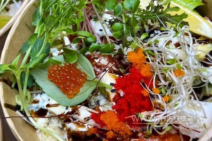 Лосось, мікс салату, авокадо, крем-сир, брі, дорблю, черрі, ікра тобіко, червона ікра, пармезан, кунжут, бальзамічна заправка.