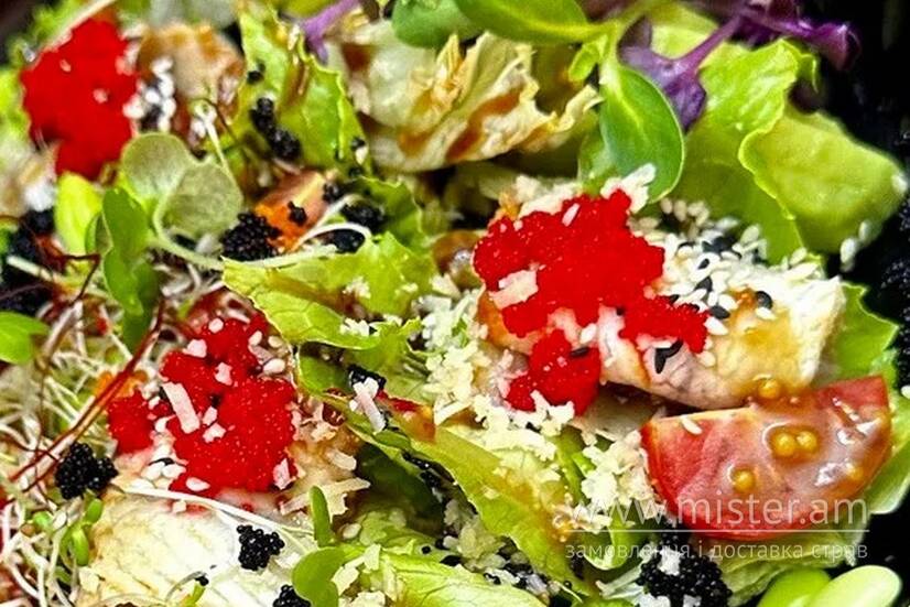 Мікс салату, вугор, авокадо, черрі, боби едамаме, пармезан, кунжут, ікра, кисло-солодка бальзамічна заправка.