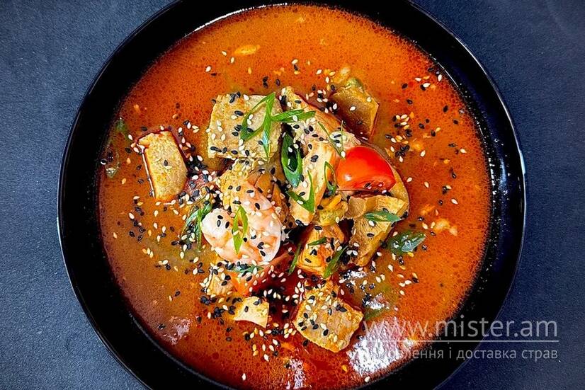 Том-ям бульйон, кокосове молоко, креветки, лосось, тунець, мідії, гриби шиїтаке, черрі, зелена цибуля, кунжут.