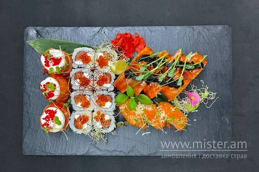 Філадельфія з лососем, Рол з лососем та червоною ікрою, Нігірі з лососем 3 шт., Бол з лососем та крем-сиром 3 шт.
