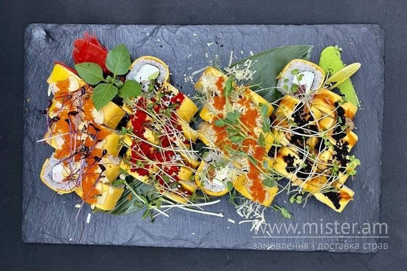 Рол сирний з тунцем, рол сирний з лососем, рол сирний з креветкою та манго, рол сирний з вугрем.