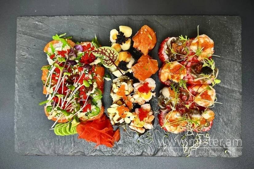 Рол з восьминогом бебі та креветкою, рол з вугрем в форелі, гункани з фореллю/гребінцем/креветкою/вугром.