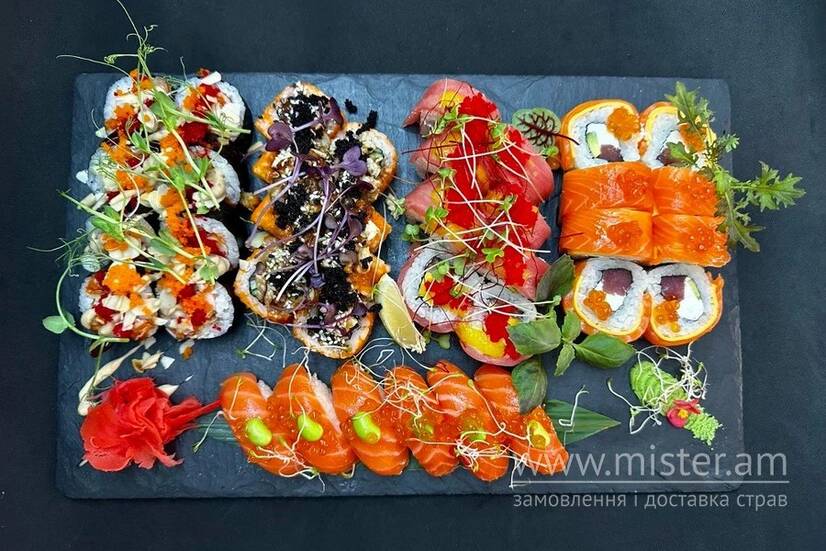 Футомак з вугрем, креветкою та лососем, рол Зпідножа, рол з тунцем, манго та лососем, рол сирний з лососем та тунцем, нігірі з лососем.