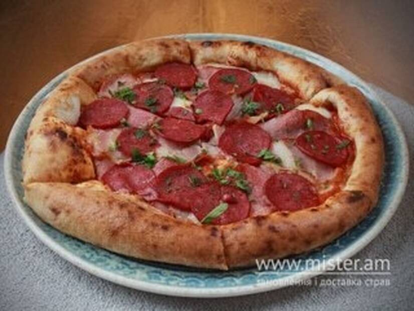Моцарелла, пепероні , шинка свиняча, шпондер свинячий, зелень, томатна основа.