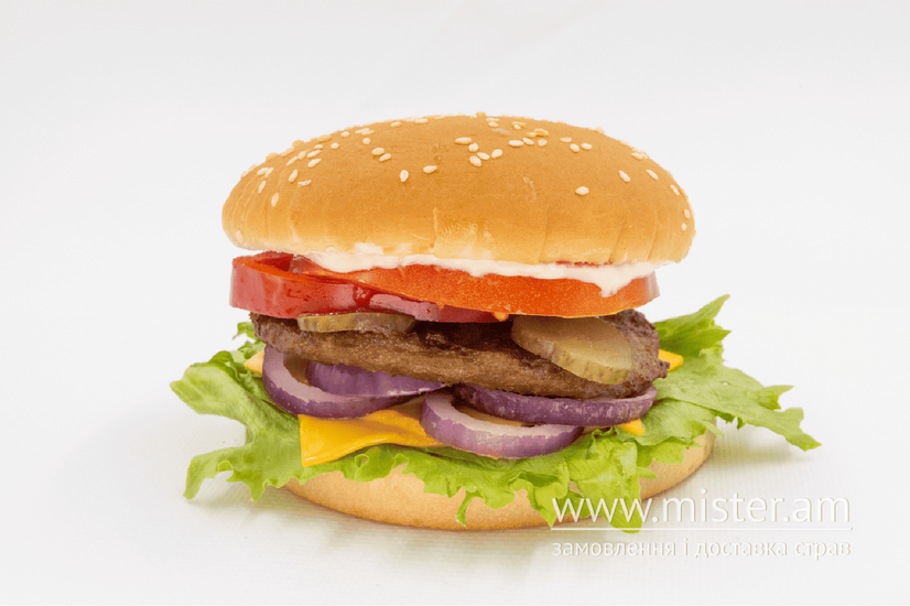 Котлета з ялович. листя Айсбергу, огірок квашений, сир Чедер, перець болгарський, Чилі, цибуля, майонез