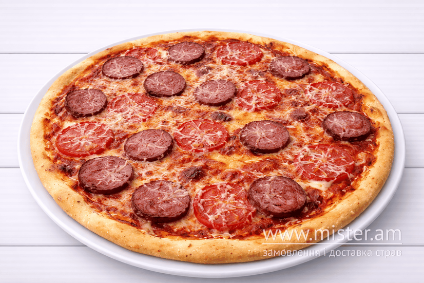 Соус пелаті, салямі, помідор чері, моцарела, базилік.
