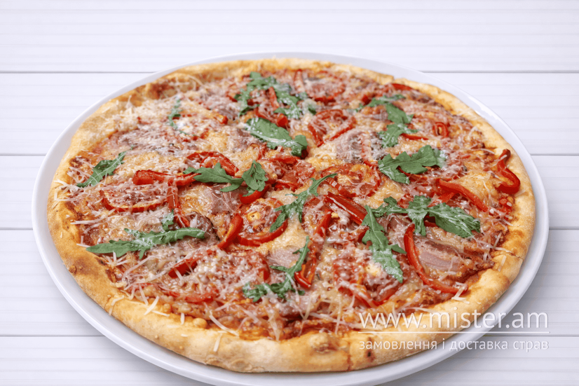 Соус пелаті, моцарела, бекон, горгонзола, перець, помідор, рукола.