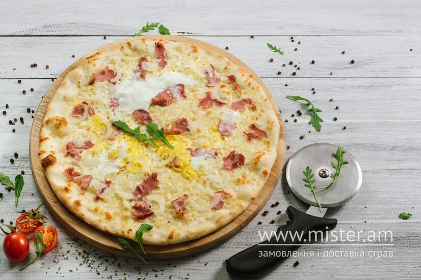 Вершковий соус, моцарела, бекон, яйце, цибуля.