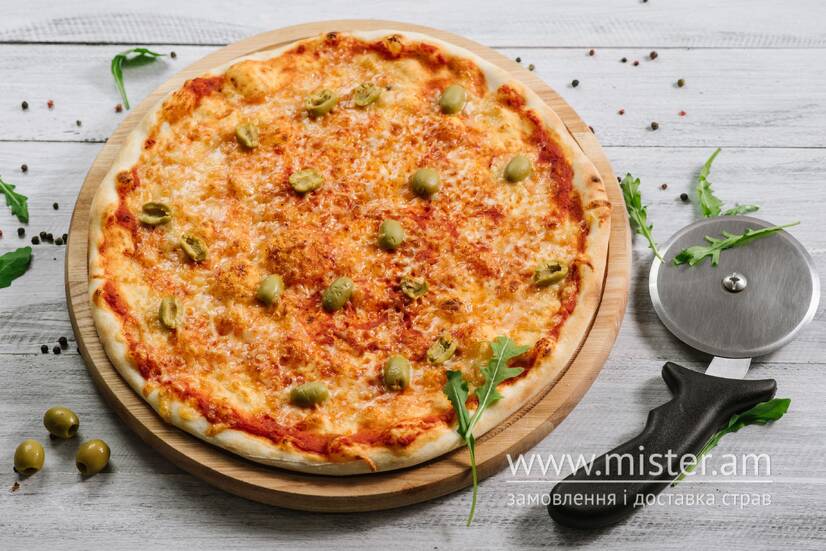 Томатний соус, моцарела, оливки.