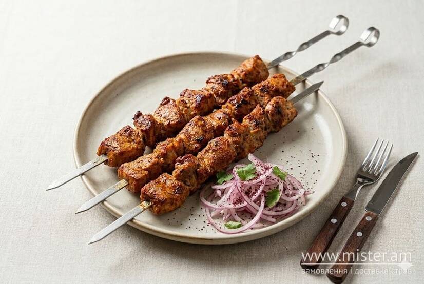 Шашлик зі свинини, картопля по-селянськи, овочі, цибуля, соус.
