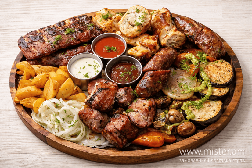 Шашлик зі свинини, шашлик курячий, ковбаски гриль, овочі гриль, картопля по-селянськи, печінка або ребра, три види соусів.