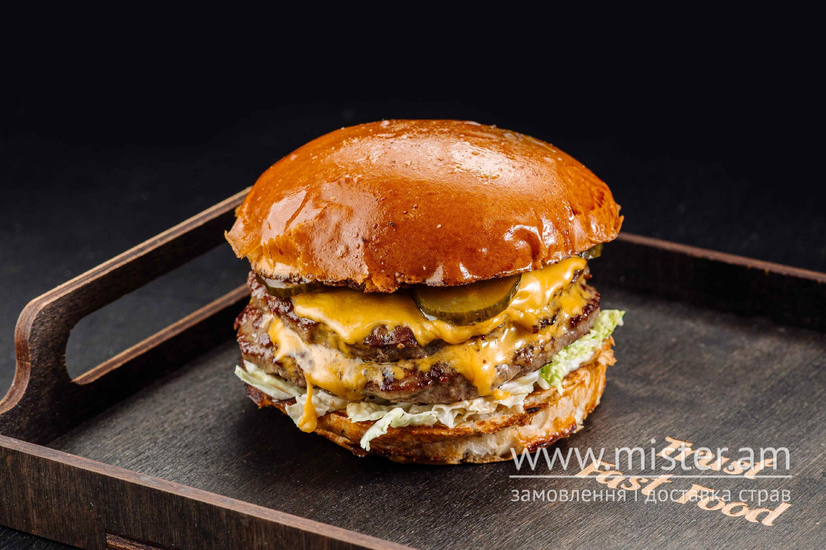 Хто любить ситно поїсти, рекомендуємо, адже подвійна котлета на пухкій булочці про це подбає, сир чеддер розтопиться на ній, огірок та кармелізована цибулька в поєднанні з нашими соусами додасть смаку.